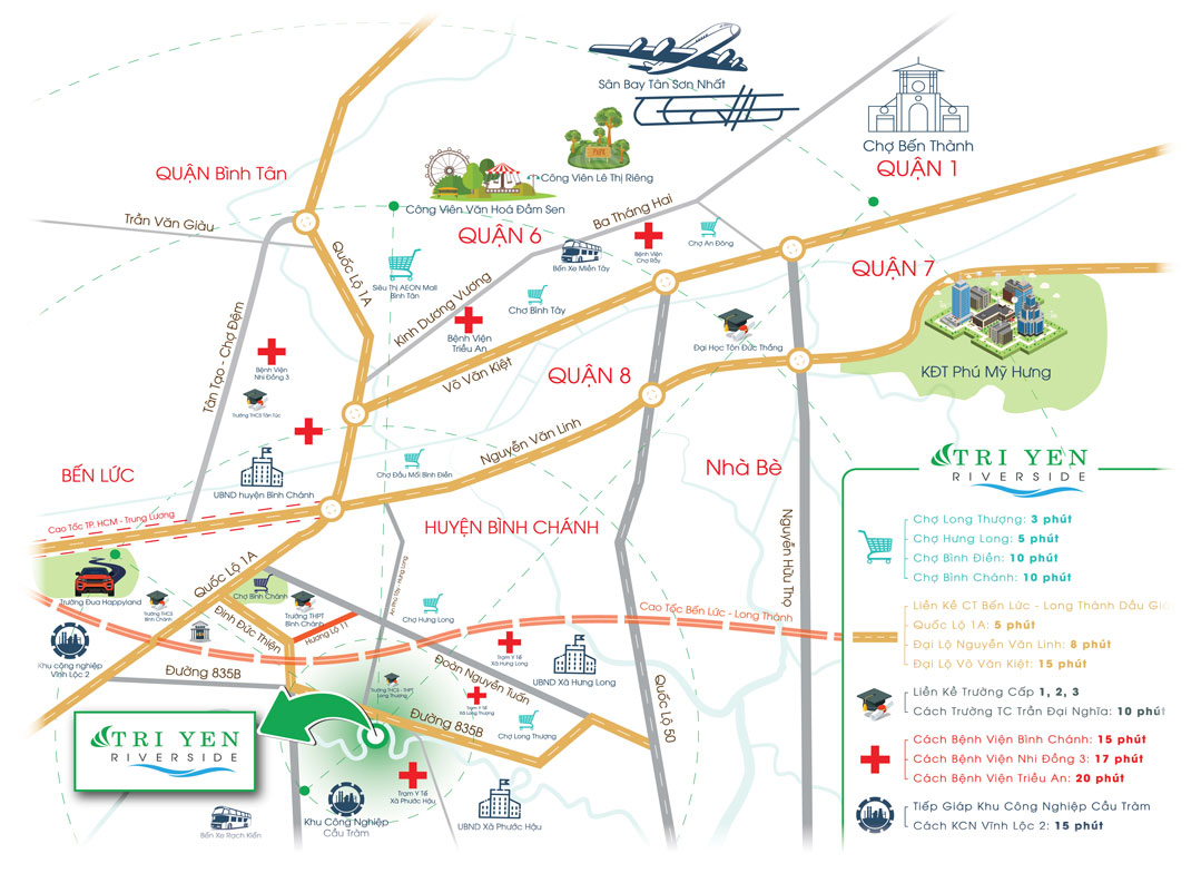 Nằm liền kề chợ Long Thượng, chợ Hưng Long ( Bình Chánh ), và nằm liền kề hệ thống giáo dục từ mầm non cho đến THPT đáp ứng mọi nhu cầu tiện ích cho khách hàng. Đặc biệt, công viên ven sông Trị Yên mở ra khung cảnh lãng mạn, thân thuộc của vùng sông nước miền Tây Nam Bộ, đem đến cho cư dân tương lai những giây phút thăng hoa và ấm cúng nhất.